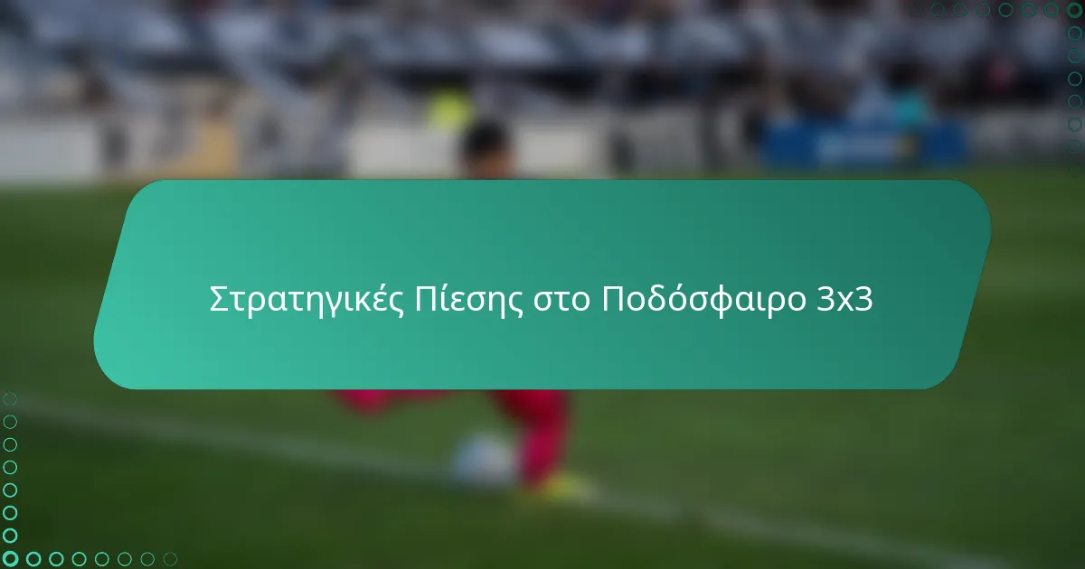 Οι αποτελεσματικές στρατηγικές πίεσης στο ποδόσφαιρο 3-ατόμων επικεντρώνονται στην μεγιστοποίηση της πίεσης στον κάτοχο της μπάλας ενώ ελαχιστοποιούν τον χώρο για τους αντιπάλους. Η υψηλή πίεση, η αντεπίθεση και οι ζωνικές προσαρμογές είναι βασικές τακτικές που μπορούν να επηρεάσουν σημαντικά την έκβαση του παιχνιδιού.
